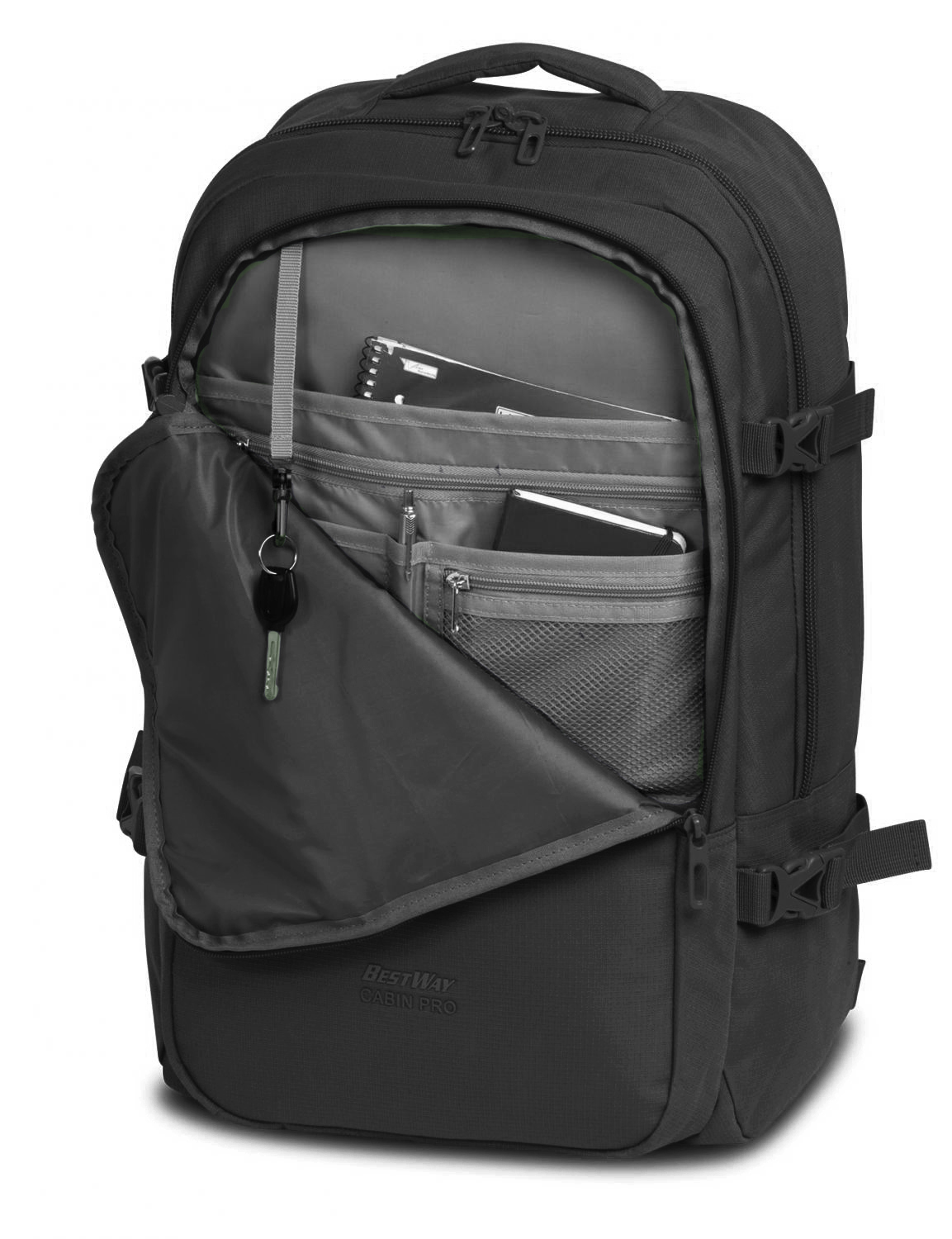 - na přední straně je velká kapsa s přihrádkou na dokumenty A4, kapsa na tablet, organizer a velká síťovinová přihrádka, karabinka na připnutí klíčů.