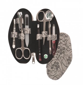 Luxusní manikúrní sada 7-dílná vyrobená z kůže s módním vzorem.  Obsahuje manikurní náčiní značky DUP a je vhodná pro celou rodinu. Uzavírá se zipem. Rozměry: 17,5 x 8 x 2 cm.