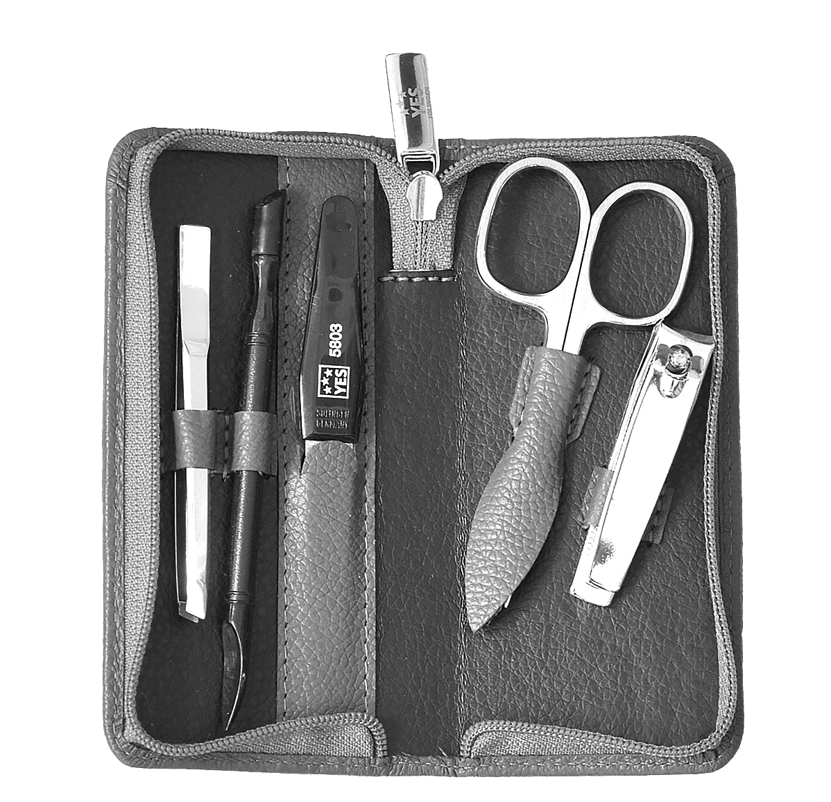 Kožená manikúrní 5-ti dílná sada vyrobená v Německu pod značkou YES Solingen se vyznačuje vysokou kvalitou nástrojů, které jsou vyrobeny z kvalitní oceli a jsou přesně naostřeny.