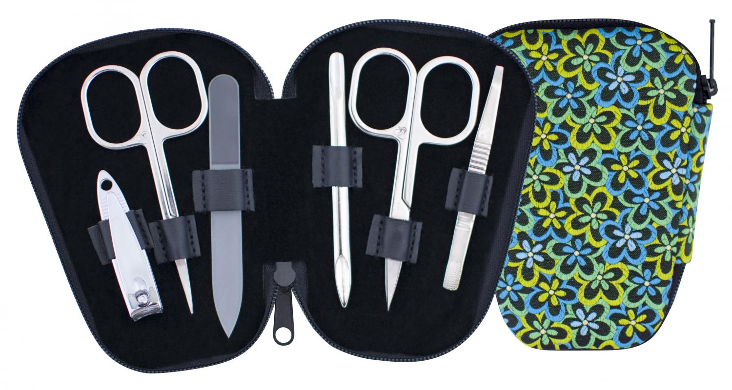 Dámský a dívčí manikúrní set 6-dílný, je vyrobený z textilní koženky s květinovým vzorkem, poutka jsou z kůže. Pouzdro se uzavírá na zip, je naplněno manikúrním náčiním značky DUP a skleněným pilníkem.