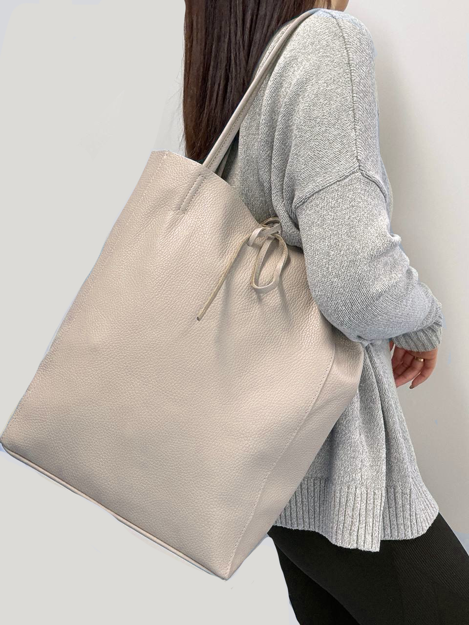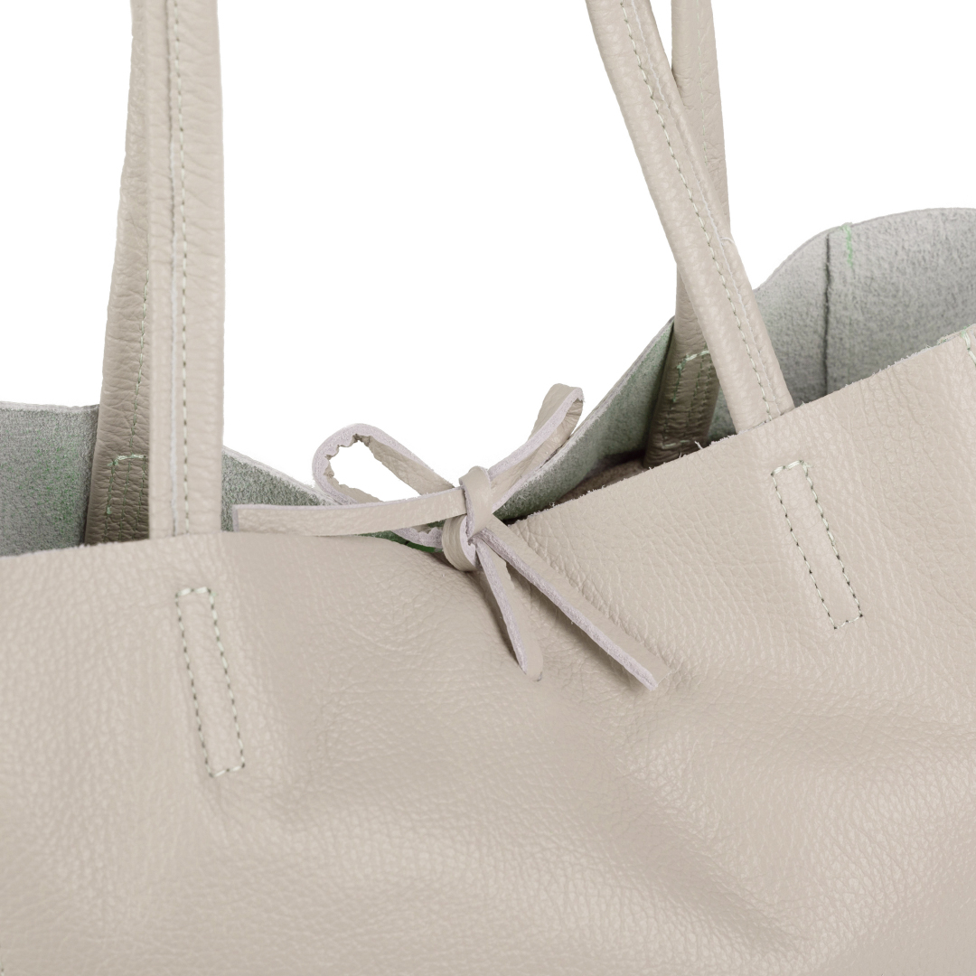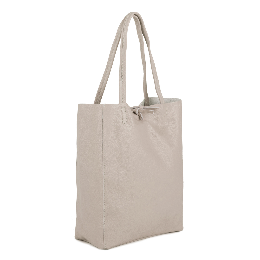 Jednoduchá velká kabelka vyrobená z odolné měkké kůže. Kabelka je v honí části otevřená , zavážete ji na koženou šňůrku. Protože kabelka nemá podšívku, uvnitř je viditelný rub kůže, ze které je kabelka vyrobena. Je prostorná a vložíte do ní i objemnější věci.