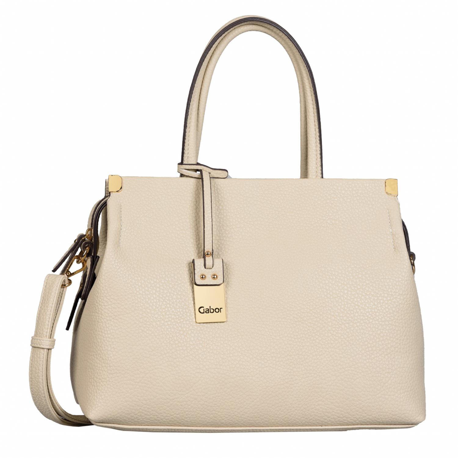 Prostorná elegantní kabelka GELA z pravidelné zrnité imitace kůže v nadčasové jemné světle béžové barvě. Díky svému klasickému tvaru a elegantnímu vzhledu se dá snadno kombinovat se všemi outfity. Díky ozdobným kovovým detailům v matné zlaté barvě a krásnému přívěsku s logem Gabor vylepší neformální městský vzhled nebo elegantní business outfit.
