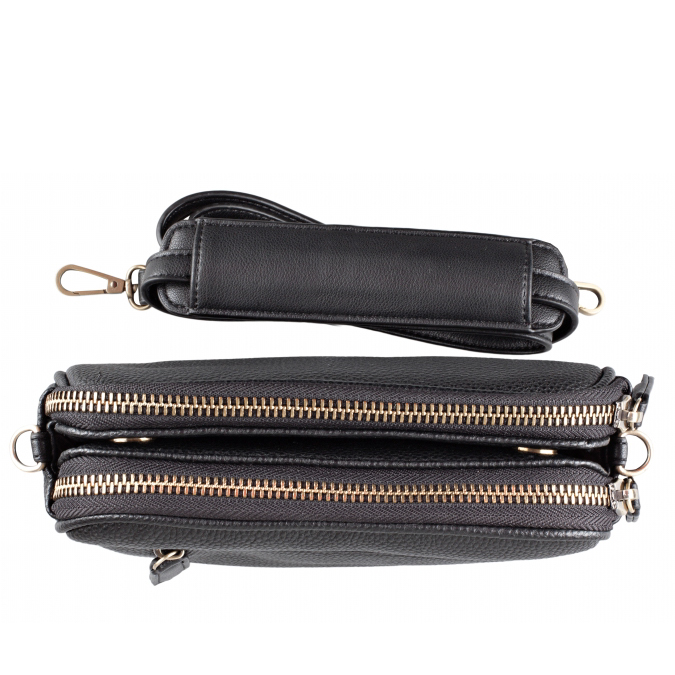 - dvě stejně velké zipové kapsy, uvnitř jedné je zipová kapsa na uložení dokladů, druhá zipová kapsa obsahuje přihrádku na mobil a přihrádky na katry