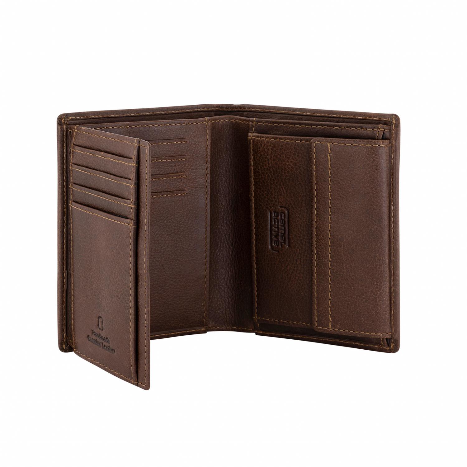 Na přední straně je vyražené logo a ozdobné prošití silnou nití. Peněženka má klasické uspořádání na bankovky a karty a díky větší velikosti vložíte i technický průkaz a jiné doklady.
