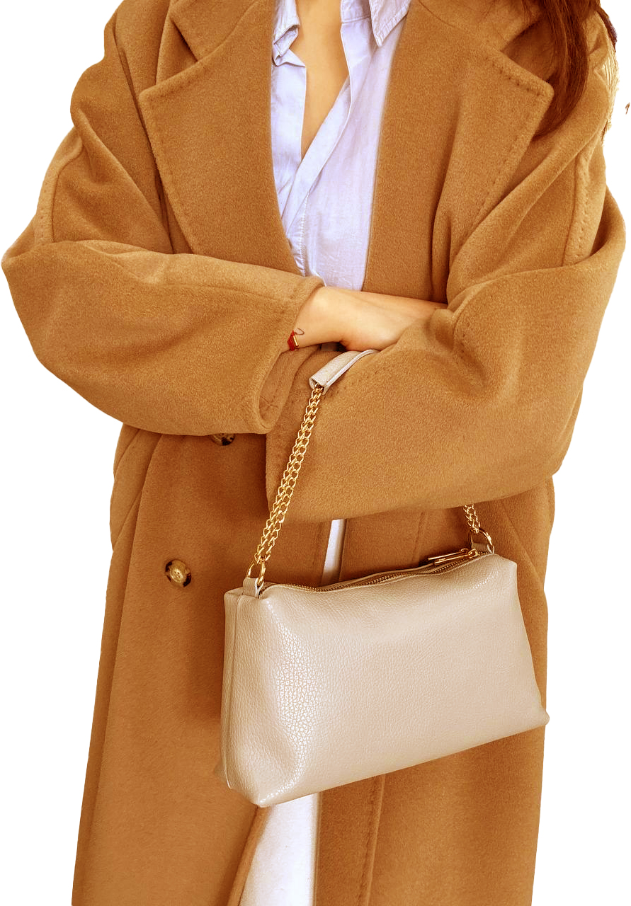 • Dvojitý zip: Hlavní předností je rozdělení na dvě samostatné sekce se zlatými zipy. To umožňuje skvělou organizaci – do jedné části můžete dát mobil a klíče, do druhé peněženku a kosmetiku.