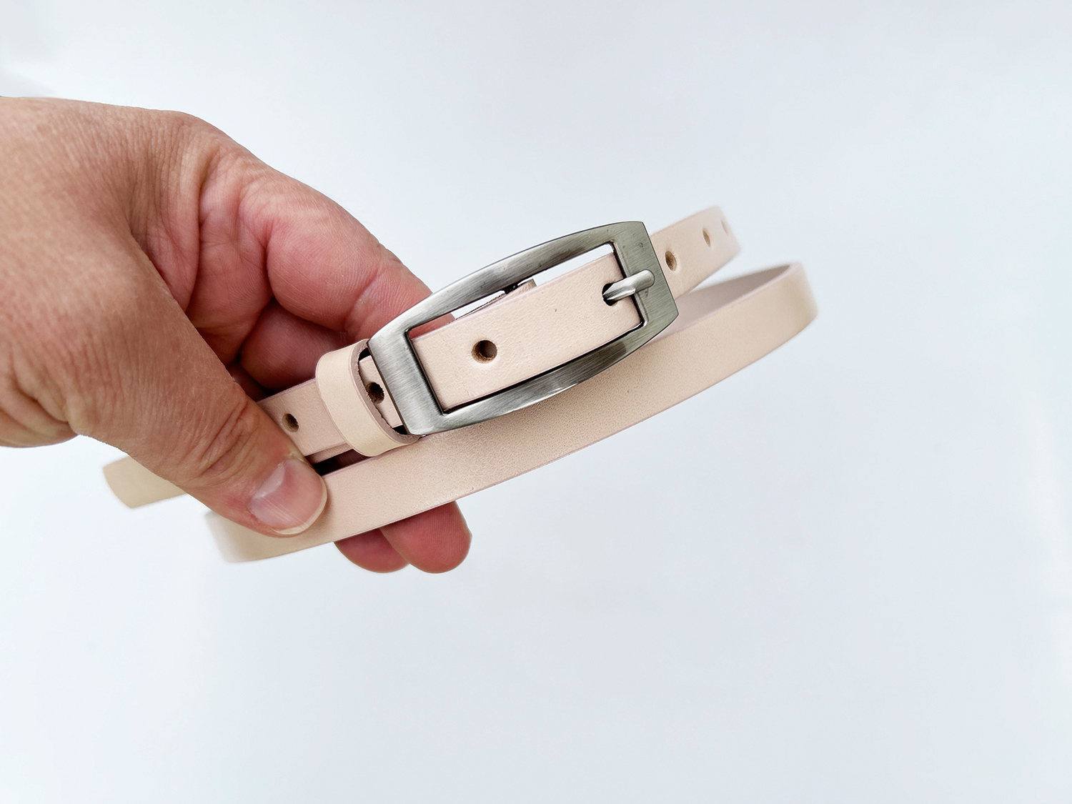 Vyrobený je z kvalitní, matné přírodní usně v oblíbeném pudrovém odstínu. Decentní spona s úpravou NKS (nikl satinato) působí moderně a zároveň nadčasově. Hrany opasku jsou pečlivě zabarvené a rub je upravený tak, aby nebarvil oblečení. Opasek není prošitý, což podtrhuje jeho minimalistickou eleganci.