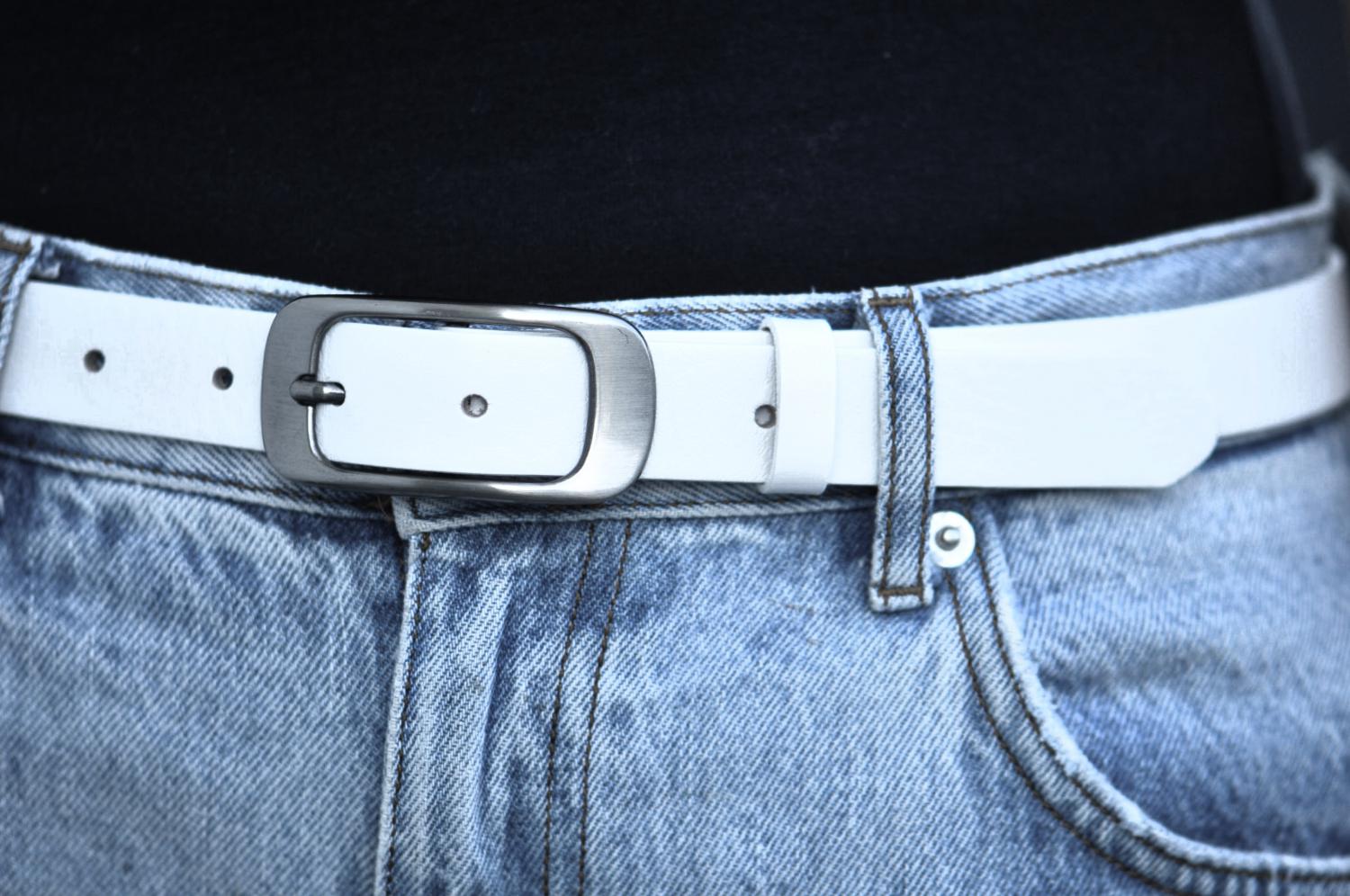 Bílý dámský kožený opasek o šířce 25 mm má pěknou decentní sponu s povrchovou úpravou NKS (nikl satinato). Tato spona obsahuje nikl. Pásek je vyrobený z bílé usně v moderní úpravě. Opasek má zabarvené hrany a upravený rub pásku, což zaručuje, že nedojde k zabarvení oděvu. Pásek není prošitý. Na výběr máte z různých délek opasků. Prvotřídní kvalita od českého výrobce.