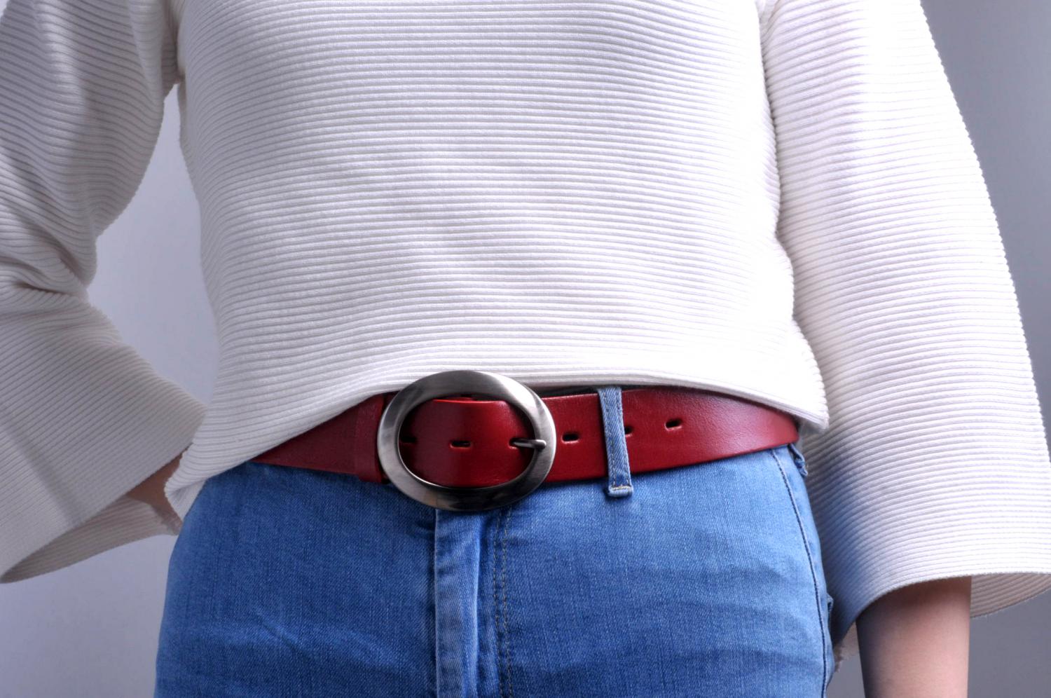 Červený dámský kožený opasek o šířce 40 mm má pěknou oválnou sponu. Pásek je vyrobený z hladké červené lesklé kůže, v moderním designu a je jednou prošitý nití v barvě kůže. Opasek má zabarvené hrany a upravený rub pásku, což zaručuje, že nedojde k zabarvení oděvu. Pásek není prošitý a lze ho zkrátit pomocí šroubku, který spojuje opasek a kožený díl se sponou. Na výběr máte z pěti různých délek opasků. Prvotřídní kvalita od českého výrobce.