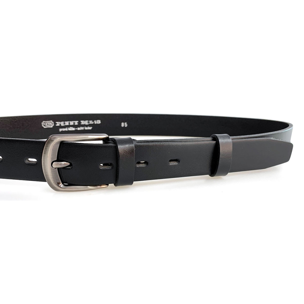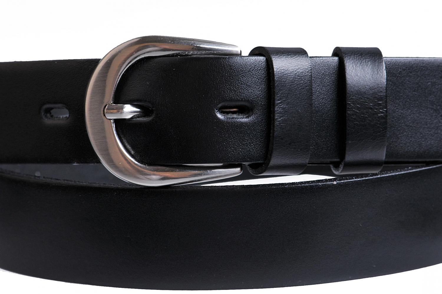 Černý dámský kožený opasek o šířce 3 cm má klasickou oválnou sponu s povrchovou úpravou NKS (nikl satinato). Tato spona obsahuje nikl. Pásek je vyrobený z černé kůže. Opasek má zabarvené hrany a upravený rub pásku, což zaručuje, že nedojde k zabarvení oděvu. Pásek lze zkrátit pomocí šroubku, který spojuje opasek a kožený díl se sponou.