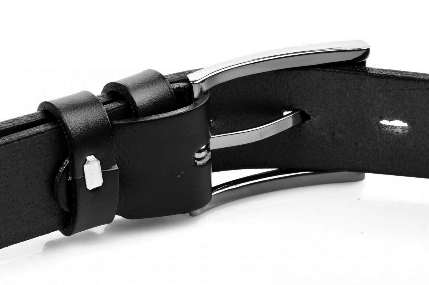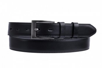 Luxusní černý pánský kožený opasek o šířce 30 mm má klasickou sponu s povrchovou úpravou NKS (nikl satinato). Tato spona obsahuje nikl. Pásek je vyrobený z hladké matné kůže se zcela patrnou strukturou. Opasek je vhodný na nošení při společenských událostech. Pásek má lakované hrany i rub opasku, což zaručuje, že nedojde k zabarvení oděvu. Opasek je prošitý a lze ho zkrátit pomocí šroubku, který spojuje pásek a kožený díl se sponou.