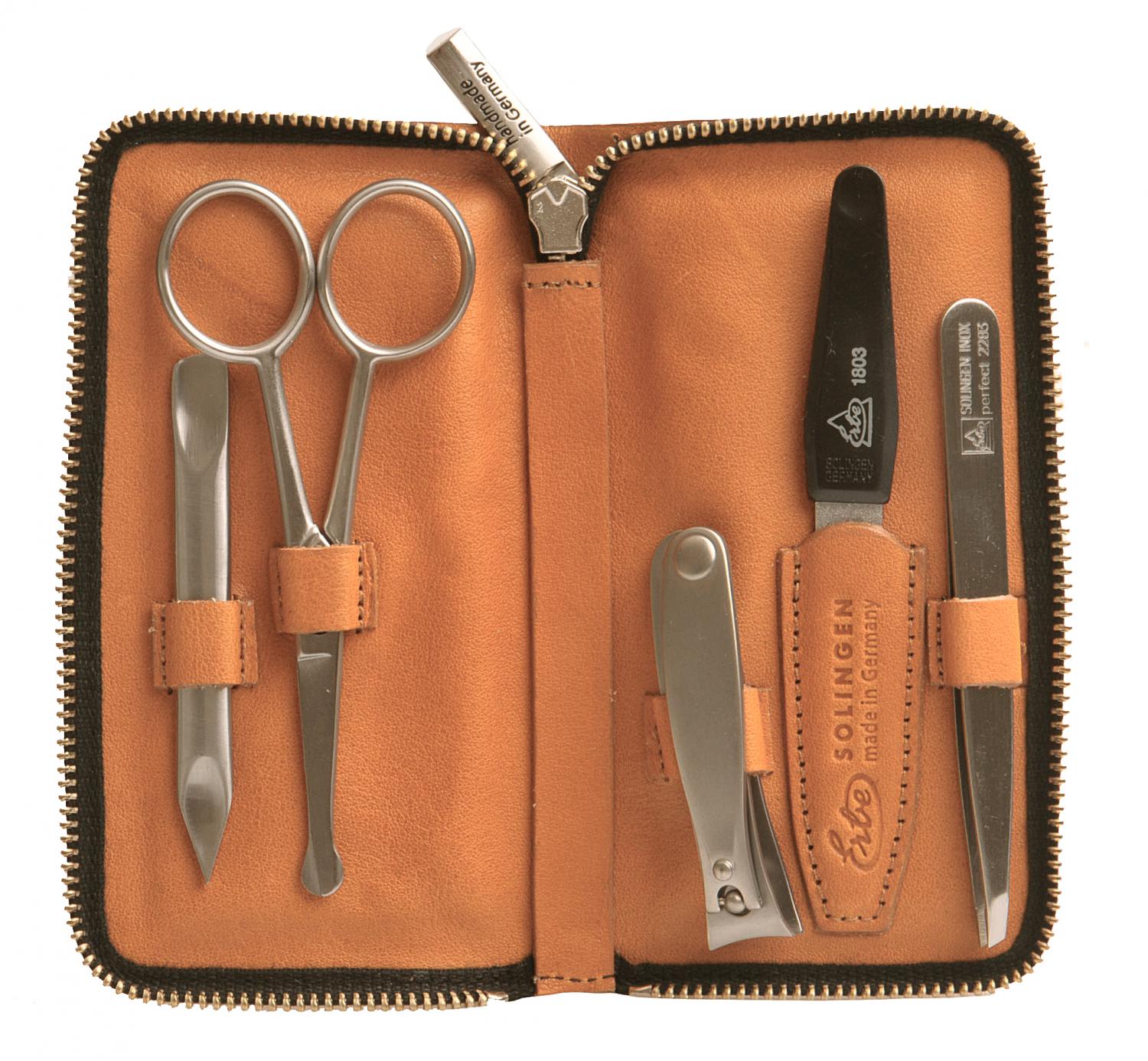 Pouzdro je vyrobeno z přírodní hovězí kůže v koňakové barvě a uzavírá se na zip. Hladká kůže je velmi atraktivní a příjemná na dotek. Uvnitř najdete 5 nástrojů, které jsou vyrobeny z nerezové, speciálně kalené oceli, odolné vůči korozi a díky tomu mají dlouhou životnost. Protože jsou vyrobeny z vysoce kvalitní oceli, zůstávají neuvěřitelně dlouho ostré.