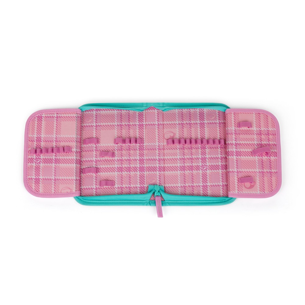 • Na dvou otevíravých chlopních je 35 pružných gumových úchytů na pastelky, pera, fixy, gumu, nůžky, kružítko a další pomůcky.