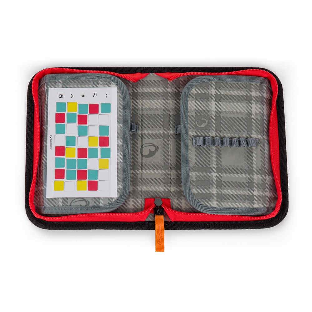 - Na dvou otevíravých chlopních je 32 pružných gumových úchytů na pastelky, pera, fixy, gumu, nůžky, kružítko a další pomůcky.