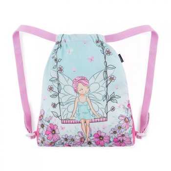 Tento půvabný látkový vak s jemným motivem víly se skvěle hodí pro malé slečny. Je prostorný a díky jednoduchému zavírání stažením popruhů do něj pohodlně uložíte přezůvky, oblečení na tělocvik či pomůcky na odpolední kroužek.