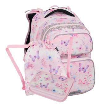 Bagmaster školní dvoukomorový batoh DOPI 25 A – motýlci je dokonalý společník pro malé školačky, které chtějí nosit do školy nejen funkční, ale i stylový batoh. Tento růžový batoh s třpytivým designem a motivem motýlků vykouzlí úsměv na tváři každé dívky. Je lehký, váží méně než kilogram, což ho činí ideálním i pro drobné děti. Díky své konstrukci a preciznímu zádovému systému je vhodný pro děti v první, druhé a třetí třídě.