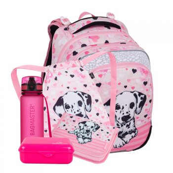 Srdíčkový batoh s roztomilým dalmatinem pro malé školačky od 1. do 3. třídy. Váží pouze 0,98 kg, přesto je prostorný. Má tři velké komory a organizér na mobil, peněženku i další cennosti. Školní batoh stojí na plastových nožkách, ve tmě chrání svými reflexními prvky. Zádový systém s nastavitelným hrudním pásem a bederním pásem má zdravotní posudek.